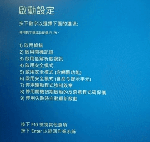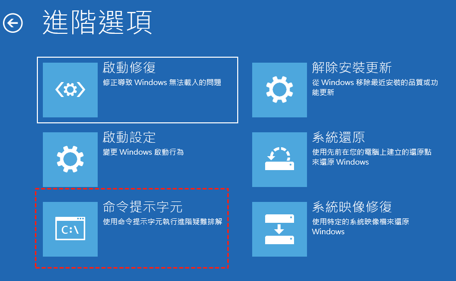 ● 帶命令提示字元的安全模式:類似於安全模式,但不是開機到 GUI,而是顯示命令提示字元。如果您需要執行命令來修復 Windows,請使用此選項。