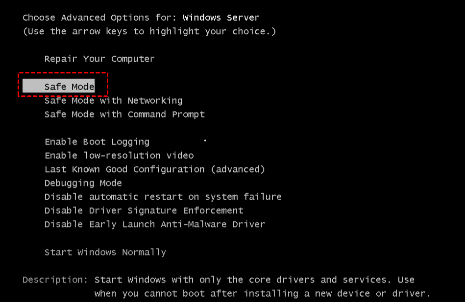 3. 伺服器將第二次重新開機。這次它將顯示“進階啟動選項”螢幕。選擇您想要使用的安全模式。