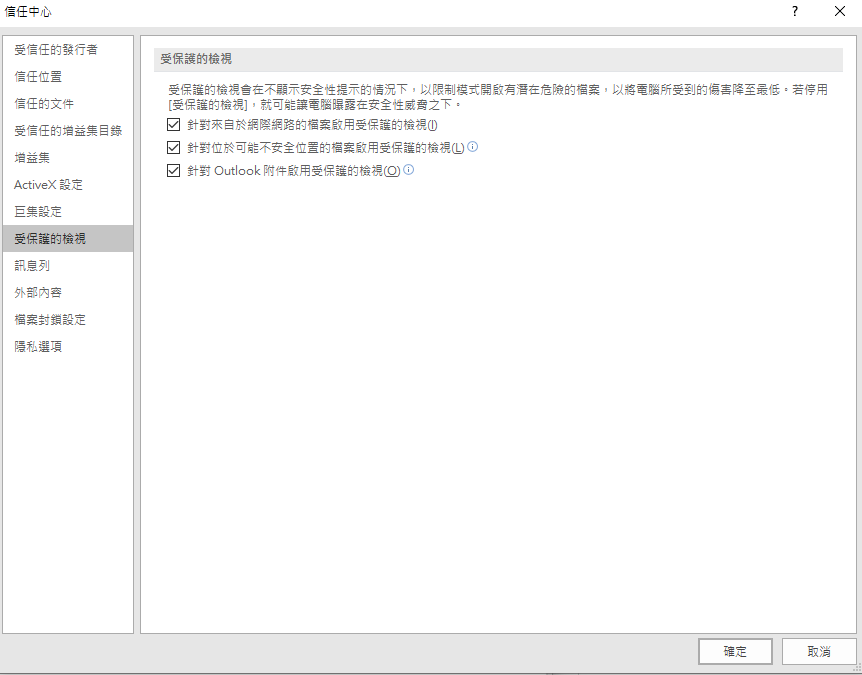 到 受保護的檢視, 然 後把項目中三 個勾都取消 ,然後記得要按確定, 理 論上就解決問題了