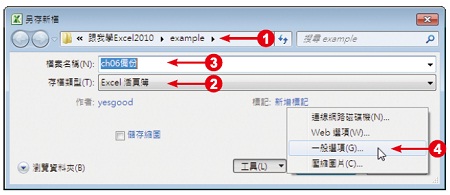 Step 1. 點選 檔案>另存新檔 指令。 Step 2. 開啟 另存新檔 對話方塊,確認要儲存檔案的位置,確認 存檔類型 為 .xlsx;輸入 檔案名稱,按【工具】鈕,點選指令清單中的 一般選項 指令。