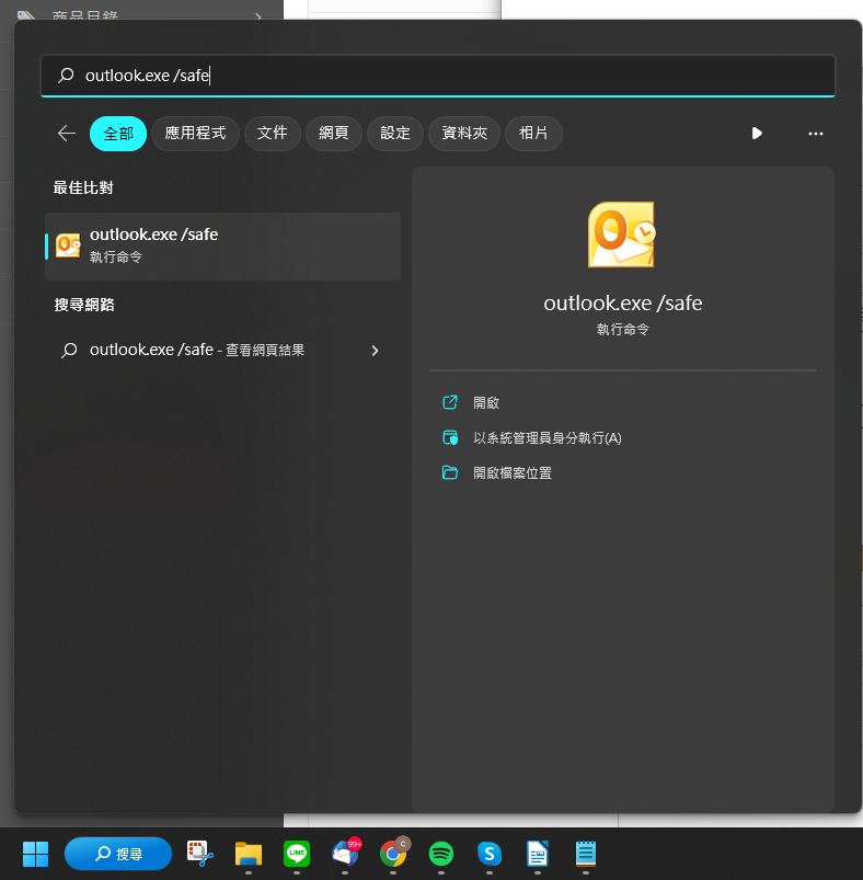 1. 關閉 Outlook。 2. 搜索或執行 Outlook.exe /safe,然後按 Enter。