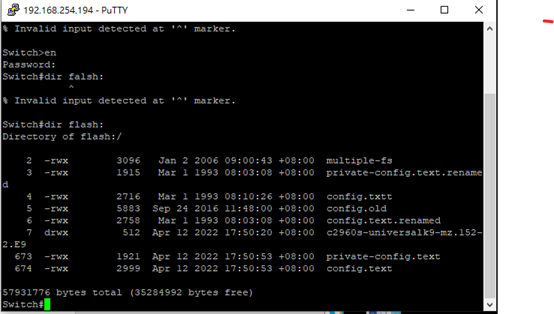 解決方法 | 1. 使用putty連接console,需安裝驅動。2. 將運作中的交換器直接把電源線拔掉或是開關關閉,按住前面板mode鍵不放,再將電源線插上或是開關打開,約2分鐘後放開。3. putty上看見 switch: 的字樣,可以輸入flash_init,然後輸入dir flash 可看到 flash 裡面的檔案列表。 |